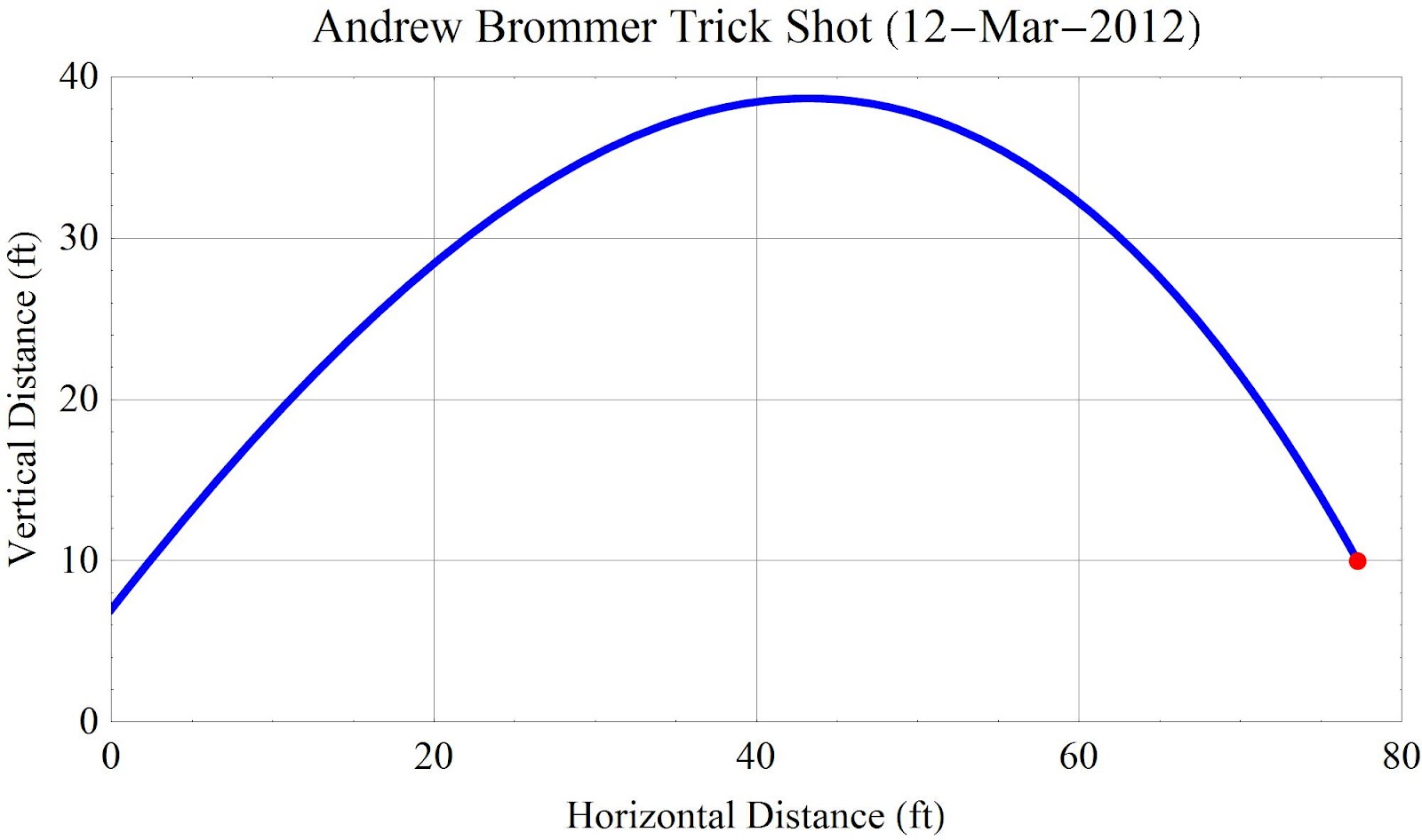 Note that the red dot on the graph represents the basket location. Note also that the date I use is the upload date for the video (if you know the date of the shot, please let me know!). The basketball left Brommer's hand at about 44.5 mph (19.9 m/s) at 52° above the horizontal. The ball reached a maximum height of 38.7 feet (11.8 m) above the court. Upon entering the basket, the ball's speed was about 29.2 mph (13.0 m/s).